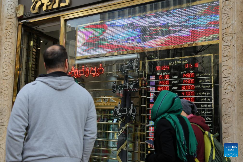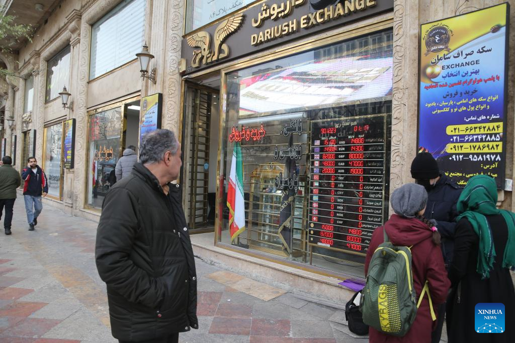 People walk past a currency exchange office in Tehran, Iran, Jan. 15, 2026. (Xinhua)