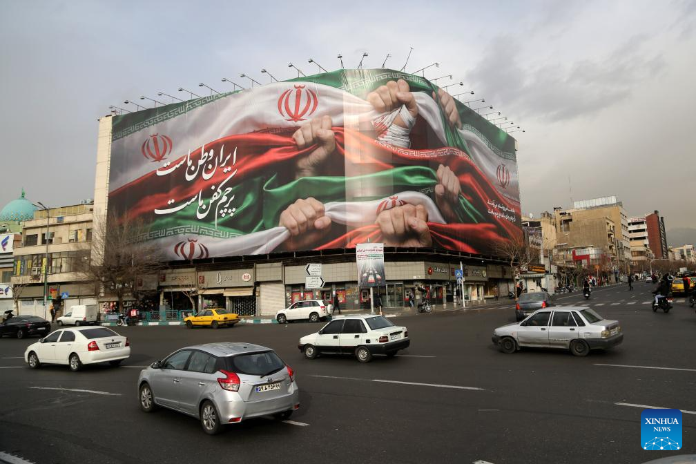 A giant banner is seen at Enghelab Square in Tehran, Iran, Jan. 15, 2026. (Xinhua)