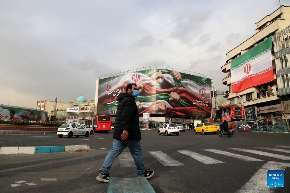 A pedestrian walks on the street at Enghelab Square in Tehran, Iran, Jan. 15, 2026. (Xinhua)