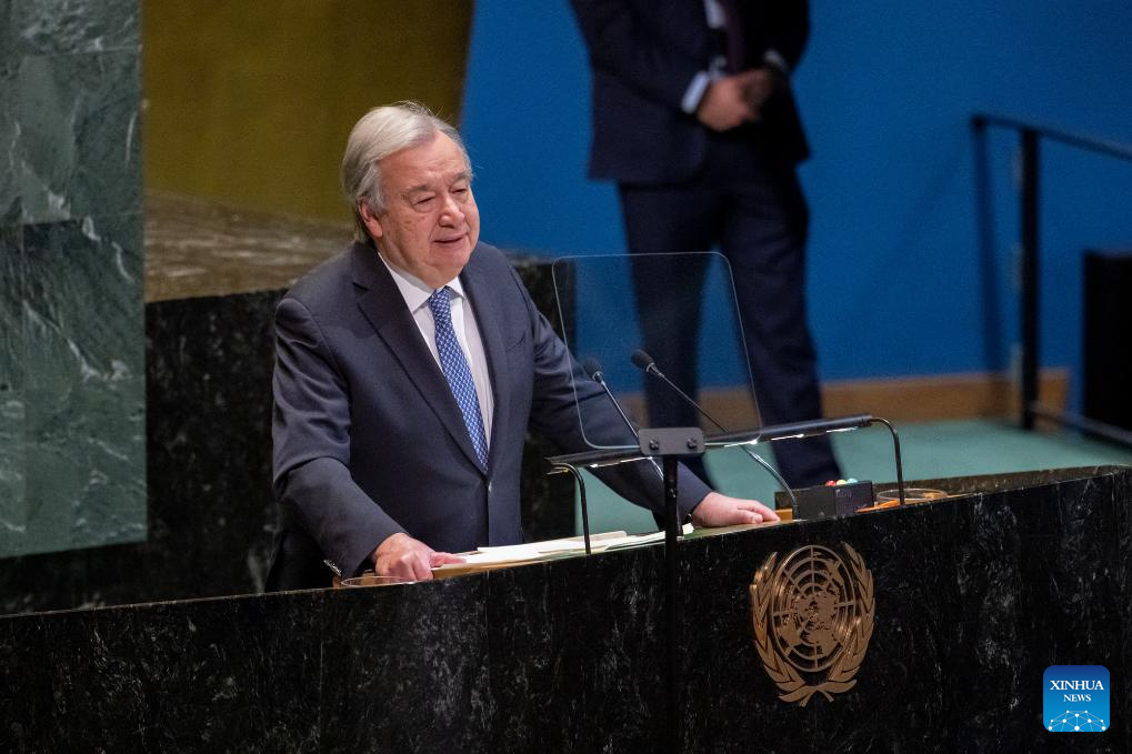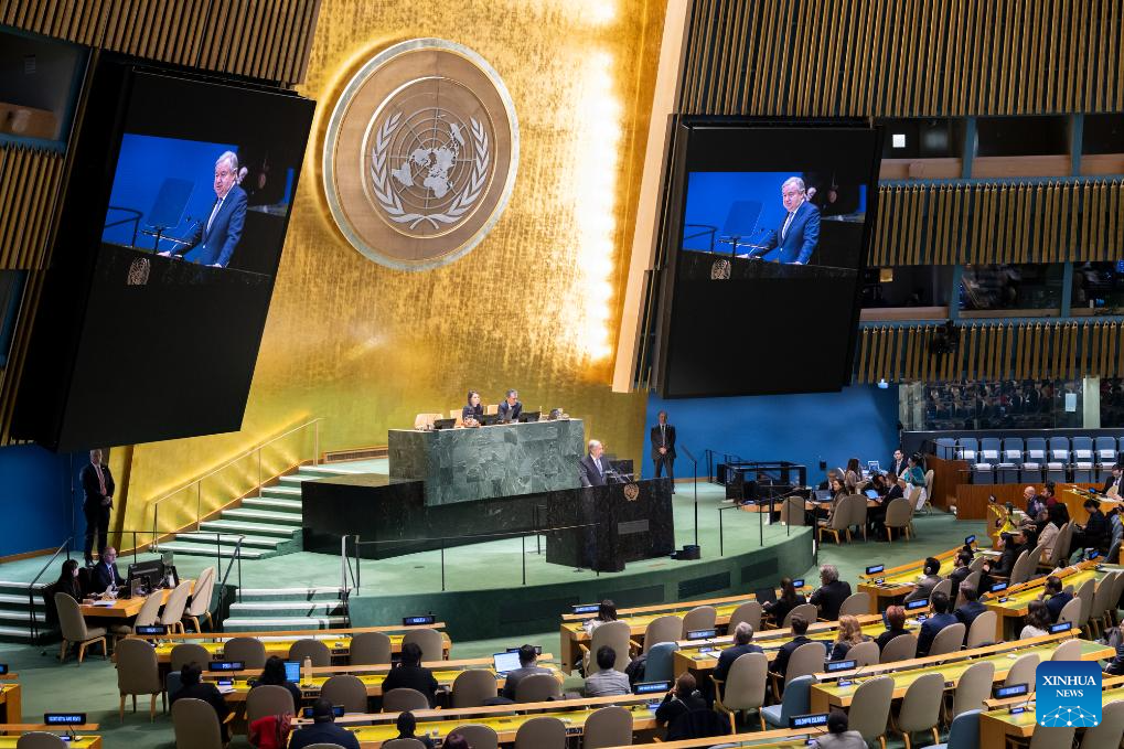 UN Secretary-General Antonio Guterres addresses the UN General Assembly on priorities for 2026 at the UN headquarters in New York, Jan. 15, 2026. Guterres emphasized three principles that guide the world body's work in 2026: adherence to the UN Charter, peace with justice -- peace between nations and peace with nature, and unity in an age of division. (Manuel Elías/UN Photo//Handout via Xinhua)