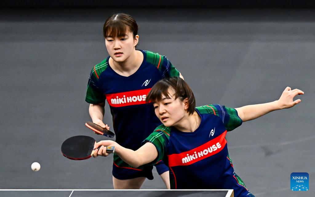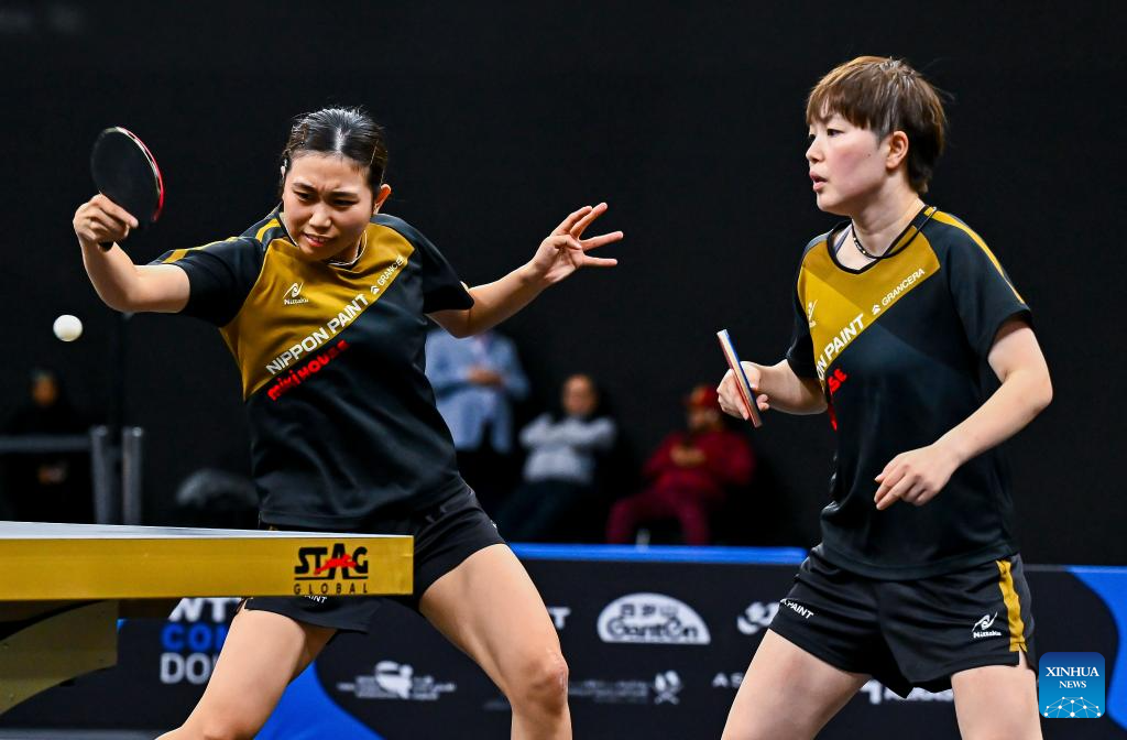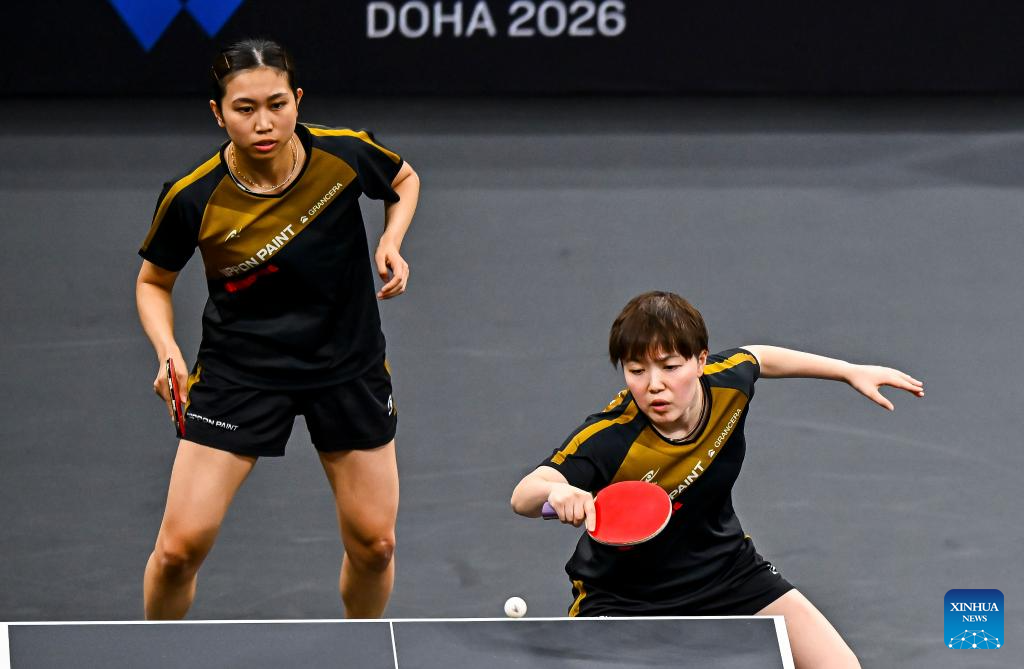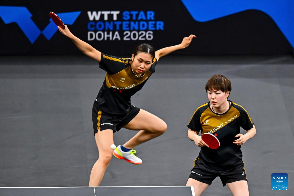 Sato Hitomi/Shibata Saki (R) of Japan compete during the women's doubles final match against Yokoi Sakura/Odo Satsuki of Japan at the WTT Star Contender Doha 2026 in Doha, Qatar, Jan. 17, 2026. (Photo by Nikku/Xinhua)