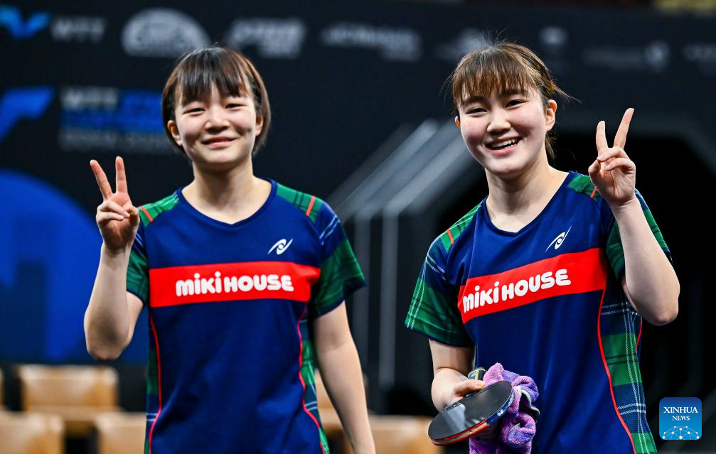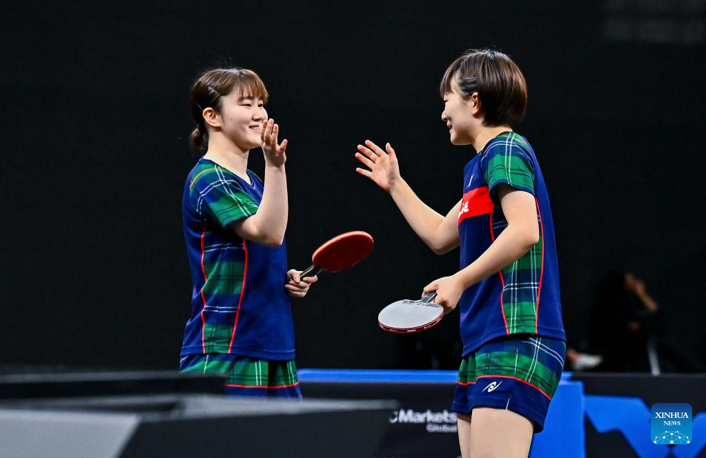 Yokoi Sakura/Odo Satsuki (L) of Japan celebrate after winning the women's doubles final match against Sato Hitomi/Shibata Saki of Japan at the WTT Star Contender Doha 2026 in Doha, Qatar, Jan. 17, 2026. (Photo by Nikku/Xinhua)