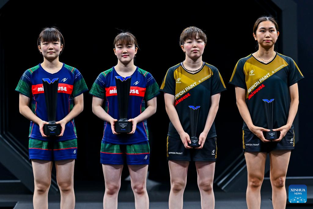 Gold medalists Yokoi Sakura (1st L)/Odo Satsuki (2nd L) of Japan and silver medalists Sato Hitomi (1st R)/Shibata Saki of Japan pose for photos during the awarding ceremony after the women's doubles final match at the WTT Star Contender Doha 2026 in Doha, Qatar, Jan. 17, 2026. (Photo by Nikku/Xinhua)