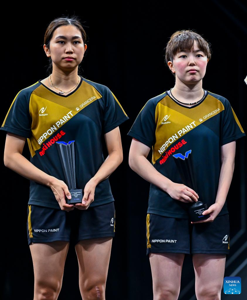 Silver medalists Sato Hitomi (L)/Shibata Saki of Japan pose for photos during the awarding ceremony after the women's doubles final match against Yokoi Sakura/Odo Satsuki of Japan at the WTT Star Contender Doha 2026 in Doha, Qatar, Jan. 17, 2026. (Photo by Nikku/Xinhua)