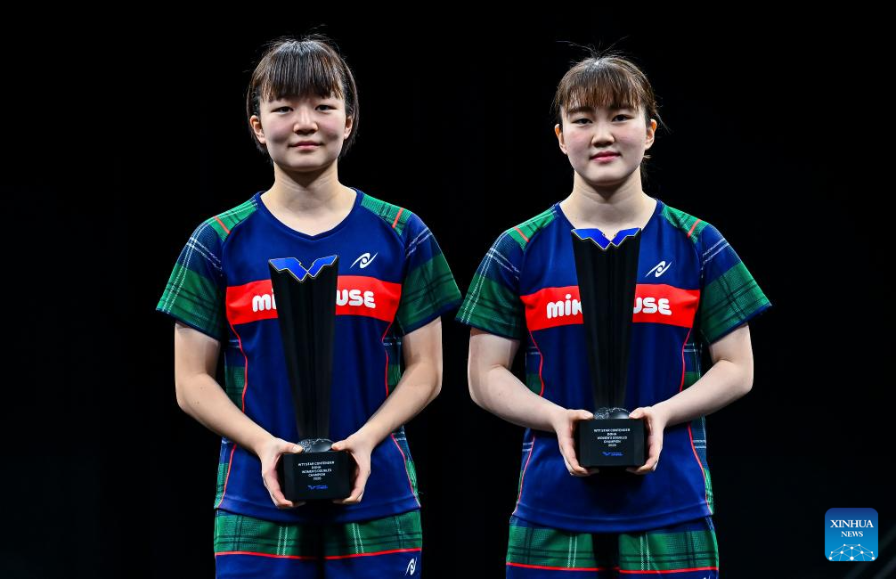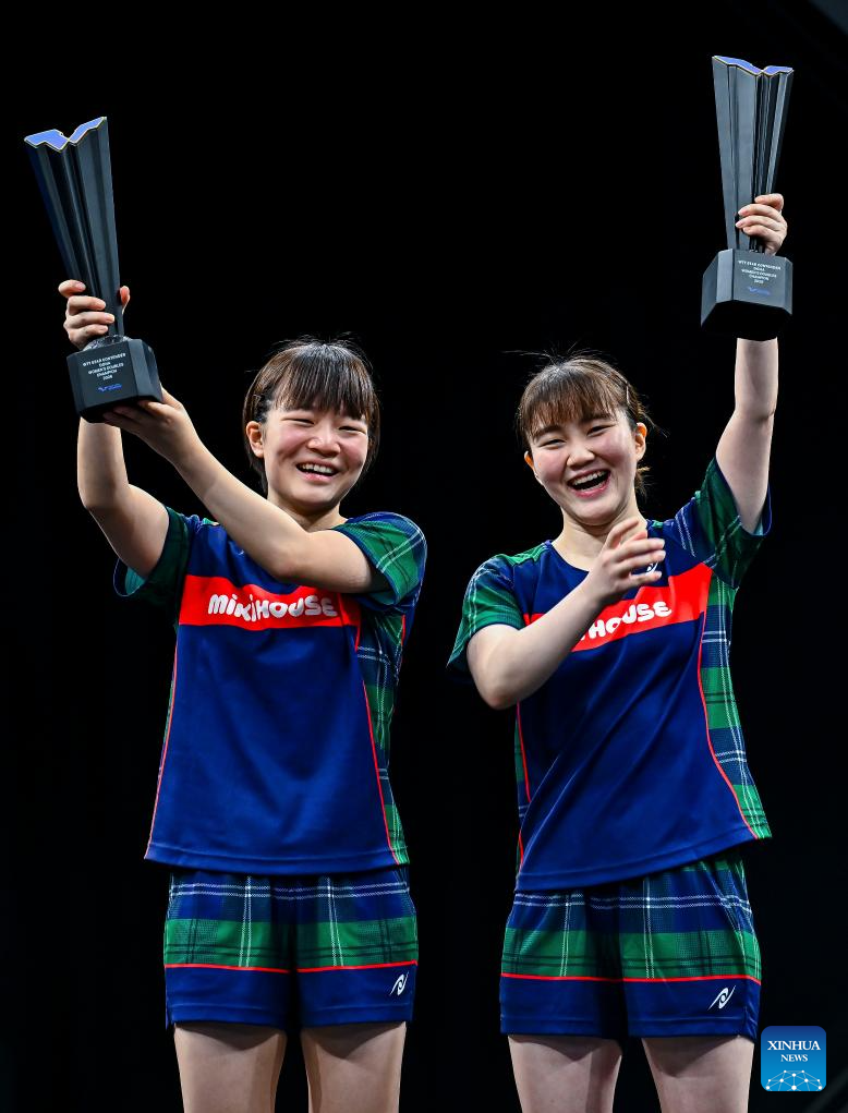 Gold medalists Yokoi Sakura (L)/Odo Satsuki of Japan pose for photos during the awarding ceremony after the women's doubles final match against Sato Hitomi/Shibata Saki of Japan at the WTT Star Contender Doha 2026 in Doha, Qatar, Jan. 17, 2026. (Photo by Nikku/Xinhua)