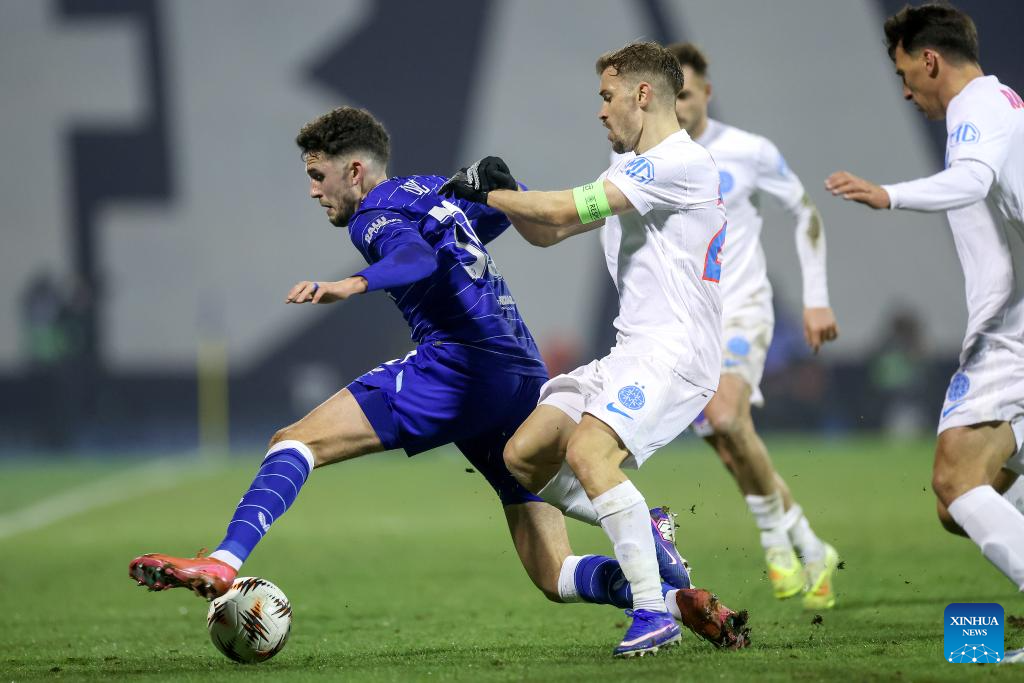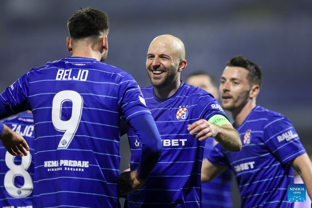 Dinamo' players celebrate a goal during the UEFA Europa League 2025/26 League Phase match between GNK Dinamo and FCSB in Zagreb, Croatia, Jan. 22, 2026. (Photo by Igor Kralj/PIXSELL via Xinhua)