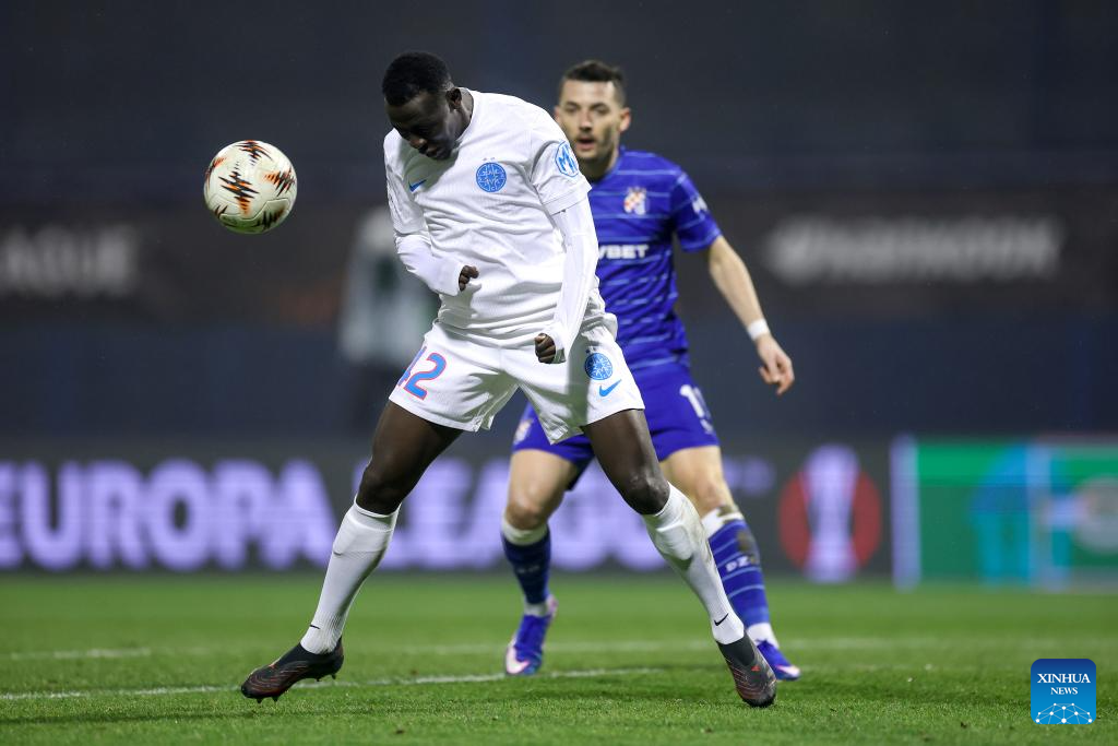 Baba Alhassan (front) of FCSB and Arber Hoxha of Dinamo compete for the ball during the UEFA Europa League 2025/26 League Phase match between GNK Dinamo and FCSB in Zagreb, Croatia, Jan. 22, 2026. (Photo by Igor Kralj/PIXSELL via Xinhua)
