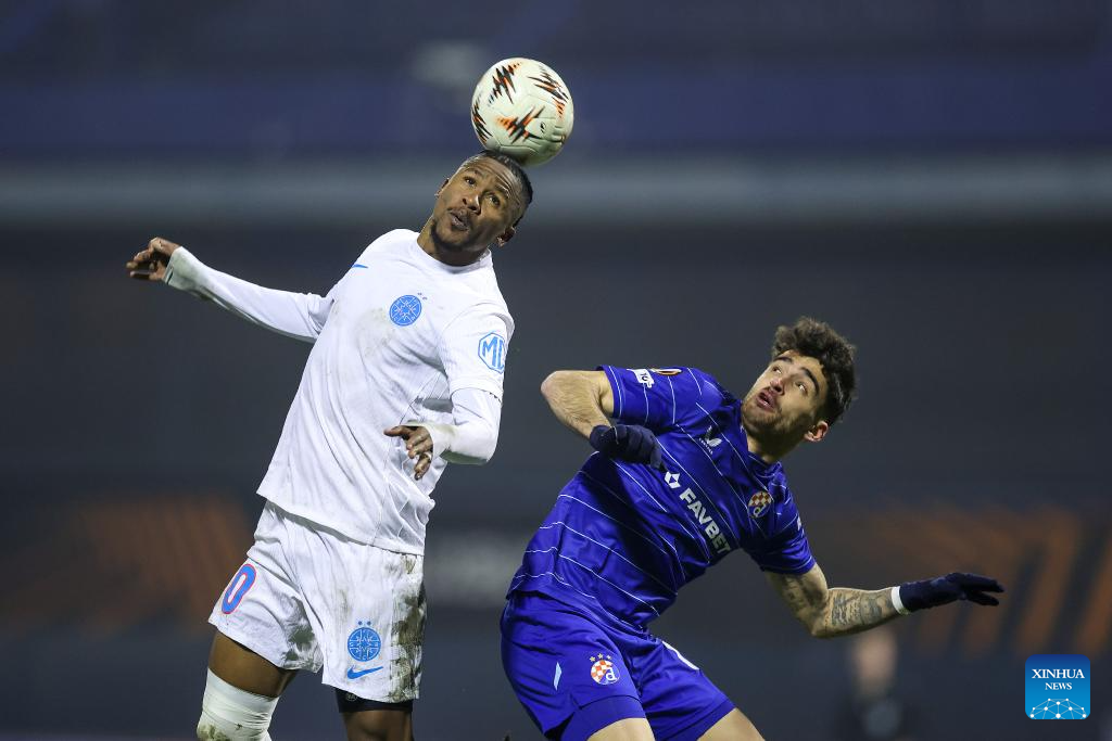 Siyabonga Ngezana (L) of FCSB and Sandro Kulenovic of Dinamo compete for the ball during the UEFA Europa League 2025/26 League Phase match between GNK Dinamo and FCSB in Zagreb, Croatia, Jan. 22, 2026. (Photo by Igor Kralj/PIXSELL via Xinhua)