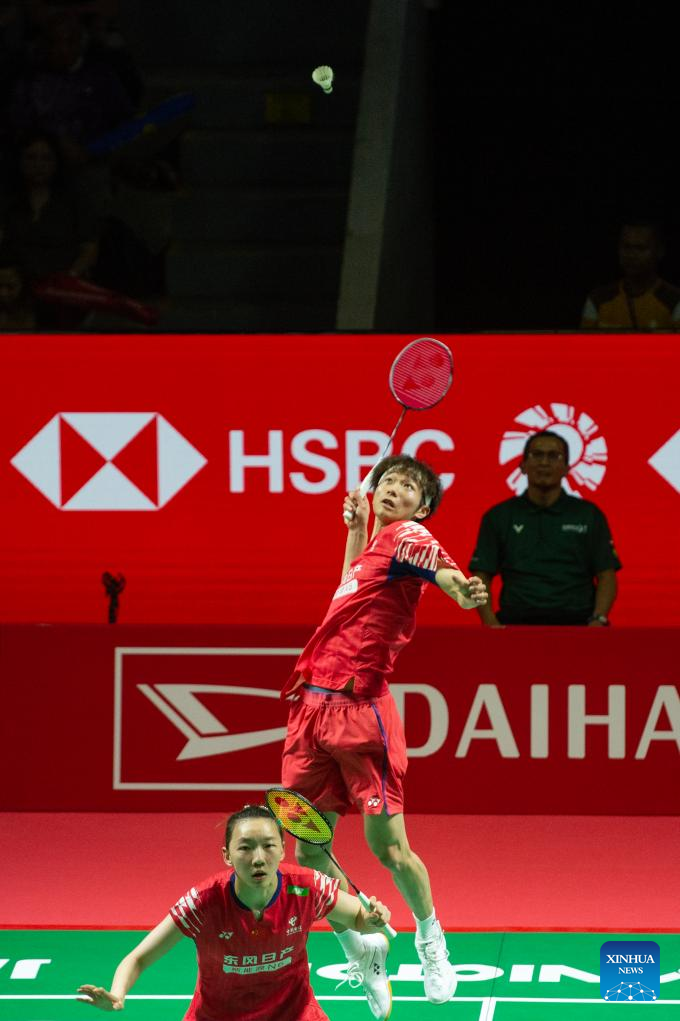 Chen Tang Jie/Toh Ee Wei (L) of Malaysia compete during the mixed doubles semifinal match against Jiang Zhenbang/Wei Yaxin of China at the Indonesia Masters 2026 badminton tournament in Jakarta, Indonesia, Jan. 24, 2026. (Xinhua/Veri Sanovri)