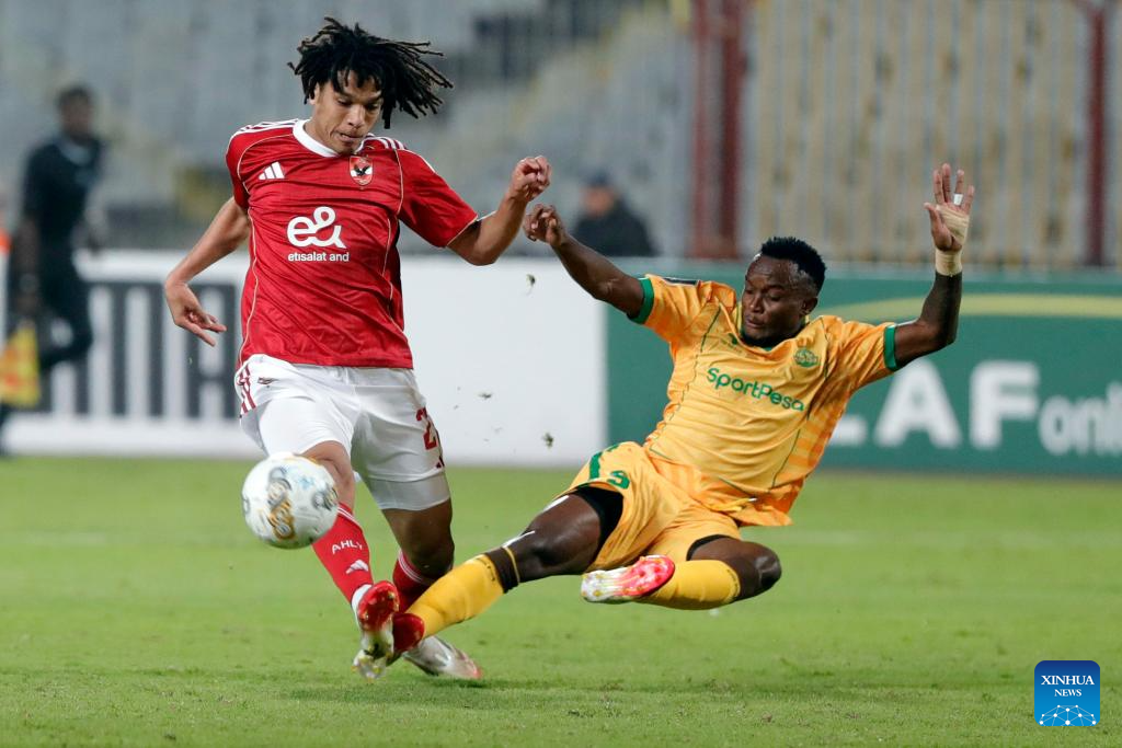 Al Ahly FC's Marwan Mohamed (L) vies for the ball during the CAF Champions League Group B match between Al Ahly FC of Egypt and Young Africans of Tanzania in Alexandria, Egypt, Jan. 23, 2026. (Xinhua/Ahmed Gomaa)