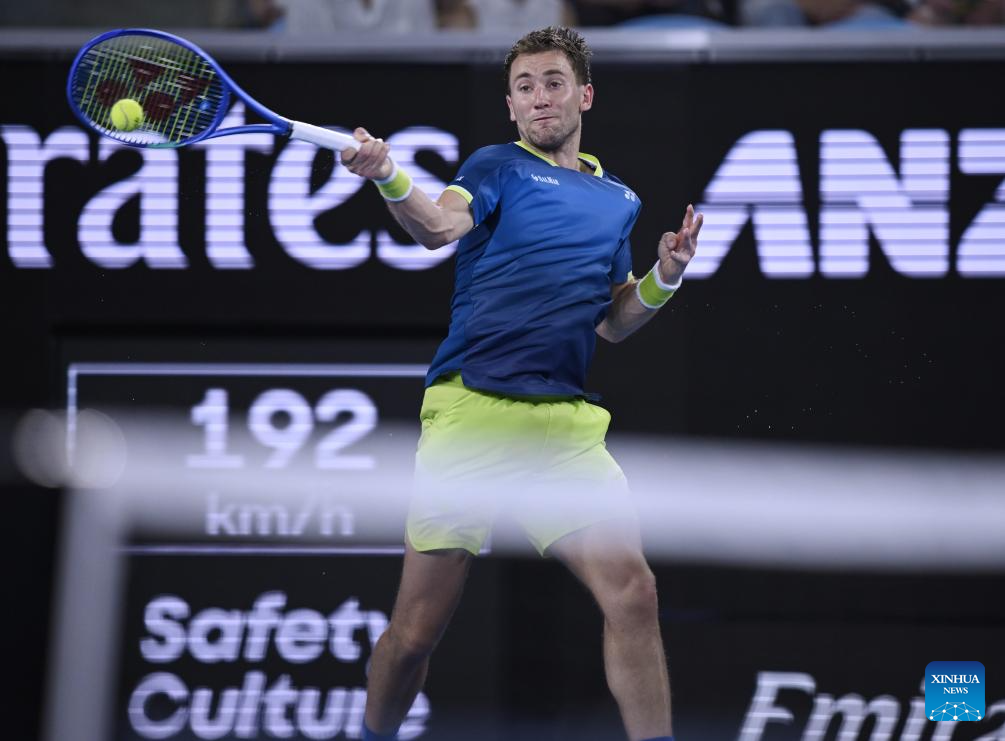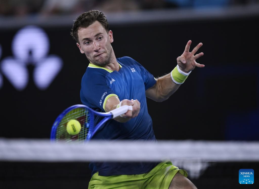 Casper Ruud hits a return during the men's singles 3rd round match between Marin Cilic of Croatia and Casper Ruud of Norway at the Australian Open tennis tournament in Melbourne, Australia, Jan. 24, 2026. (Photo by Wang Shen/Xinhua)