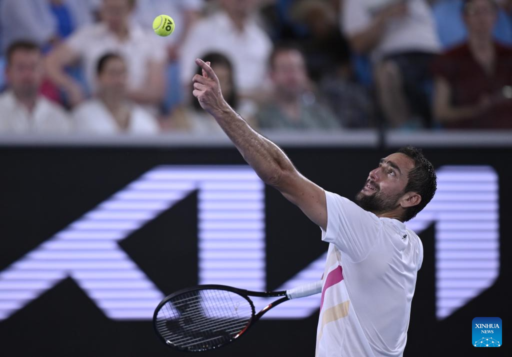 Marin Cilic serves during the men's singles 3rd round match between Marin Cilic of Croatia and Casper Ruud of Norway at the Australian Open tennis tournament in Melbourne, Australia, Jan. 24, 2026. (Photo by Wang Shen/Xinhua)