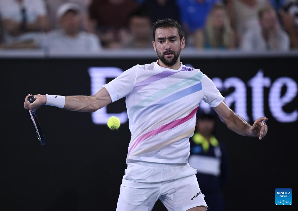 Marin Cilic hits a return during the men's singles 3rd round match between Marin Cilic of Croatia and Casper Ruud of Norway at the Australian Open tennis tournament in Melbourne, Australia, Jan. 24, 2026. (Photo by Wang Shen/Xinhua)