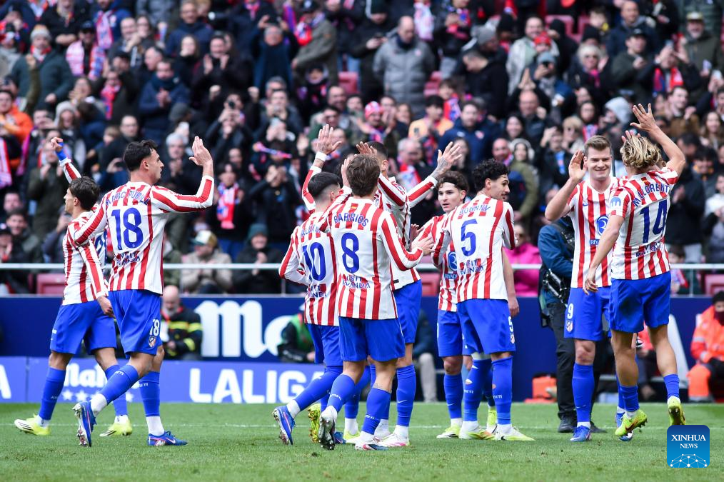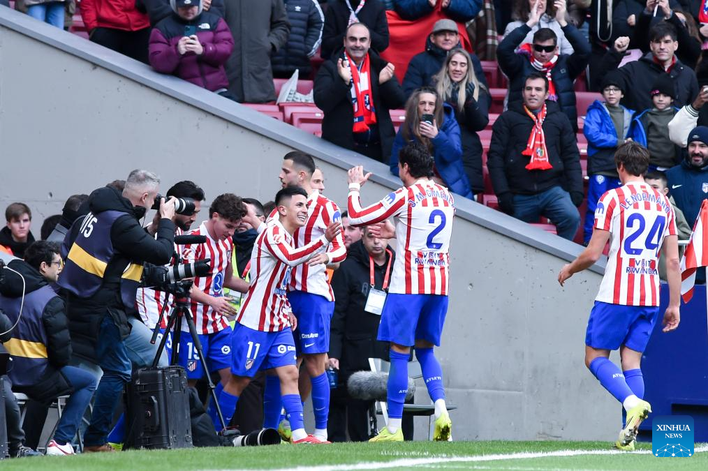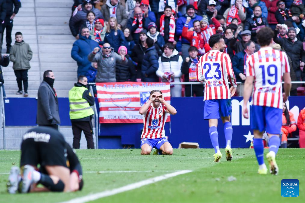 Atletico de Madrid's players celebrate a goal during La Liga football match between Atletico de Madrid and RCD Mallorca in Madrid, Spain, Jan. 25, 2026. (Photo by Gustavo Valiente/Xinhua)