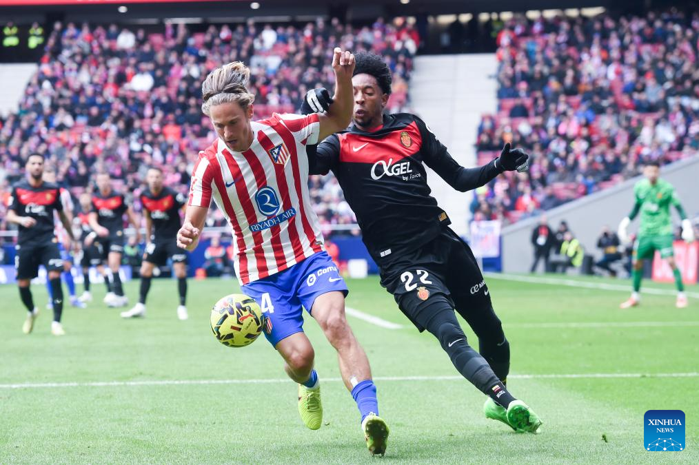 Atletico de Madrid's M. Llorente (L) vies with RCD Mallorca's Johan Mojica during La Liga football match between Atletico de Madrid and RCD Mallorca in Madrid, Spain, Jan. 25, 2026. (Photo by Gustavo Valiente/Xinhua)