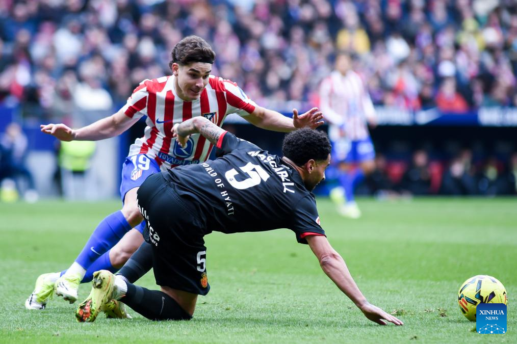 Atletico de Madrid's J. Alvarez (L) vies with RCD Mallorca's Mascarell during La Liga football match between Atletico de Madrid and RCD Mallorca in Madrid, Spain, Jan. 25, 2026. (Photo by Gustavo Valiente/Xinhua)