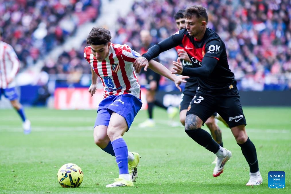 Atletico de Madrid's J. Alvarez (L) vies with RCD Mallorca's Maffeo during La Liga football match between Atletico de Madrid and RCD Mallorca in Madrid, Spain, Jan. 25, 2026. (Photo by Gustavo Valiente/Xinhua)