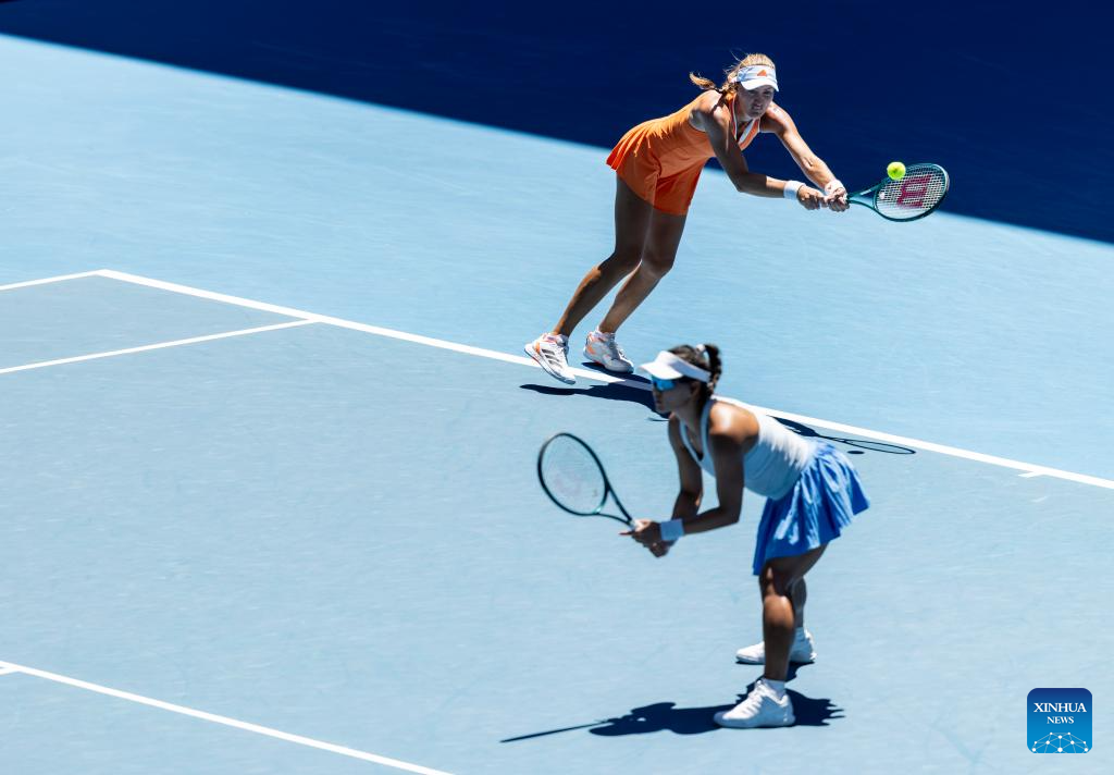 Kimberley Birrell (R)/Talia Gibson compete during the women's doubles 3rd round match between Guo Hanyu (China)/Kristina Mladenovic (France) and Kimberley Birrell/Talia Gibson of Australia at the Australian Open tennis tournament in Melbourne, Australia, Jan. 26, 2026. (Photo by Hu Jingchen/Xinhua)
