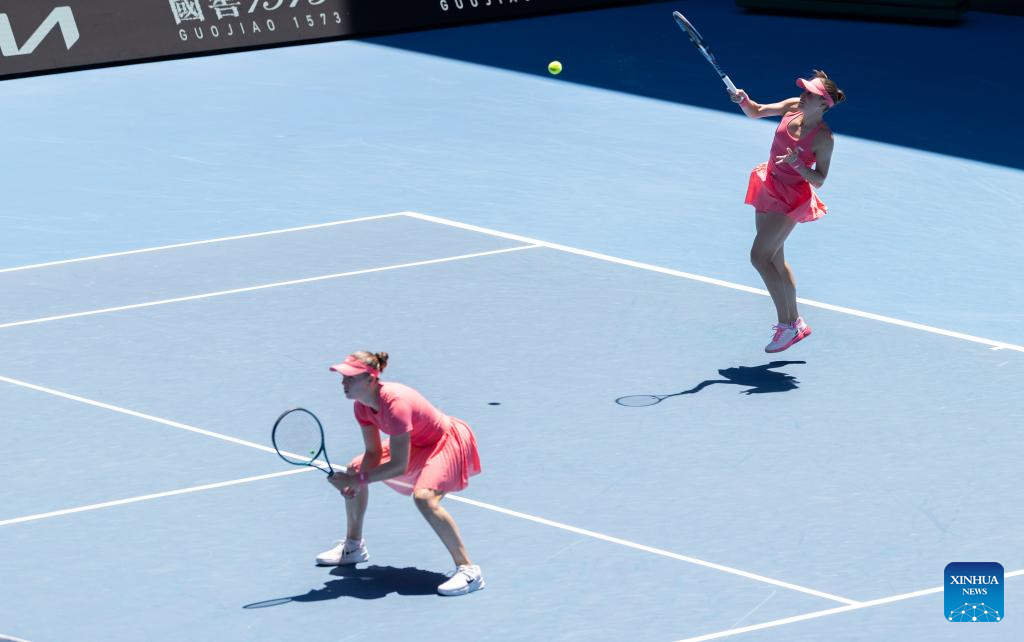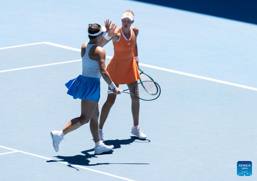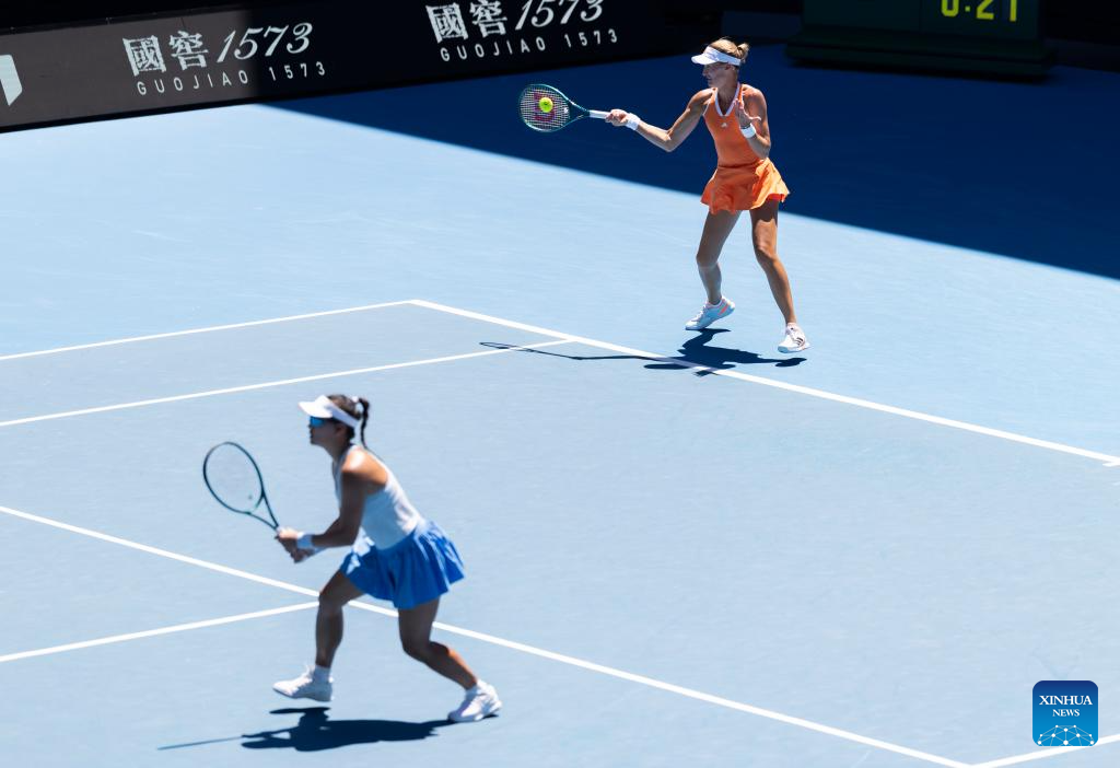 Guo Hanyu (front)/Kristina Mladenovic compete during the women's doubles 3rd round match between Guo Hanyu (China)/Kristina Mladenovic (France) and Kimberley Birrell/Talia Gibson of Australia at the Australian Open tennis tournament in Melbourne, Australia, Jan. 26, 2026. (Photo by Hu Jingchen/Xinhua)