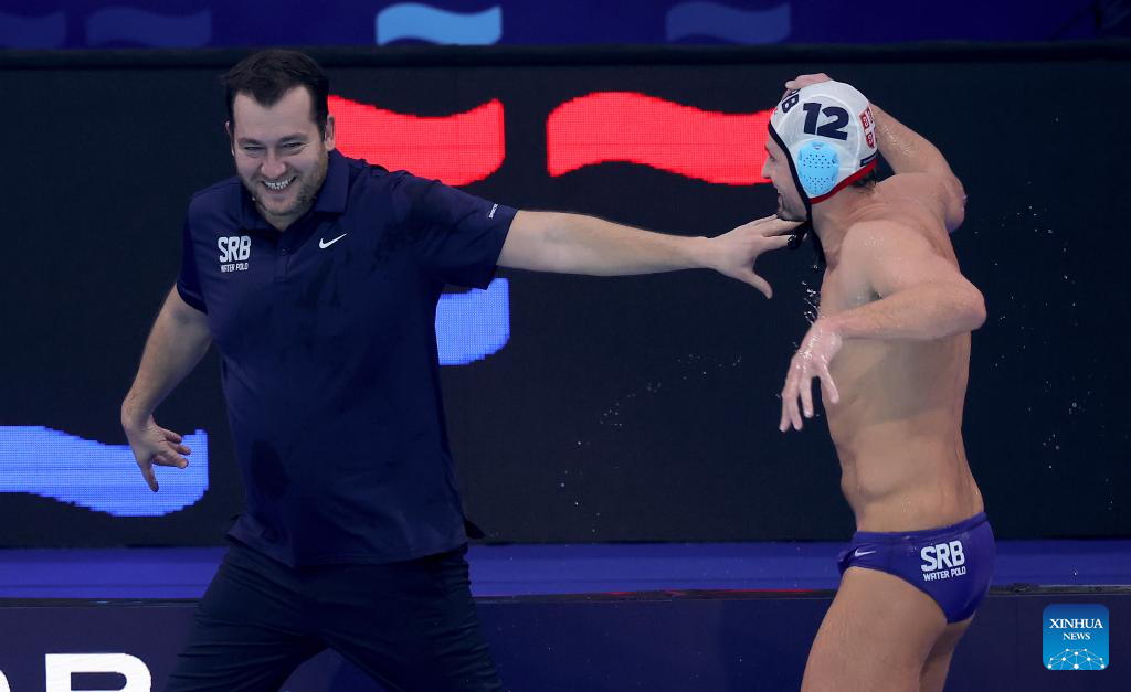 Serbia's head coach Uros Stevanovic (L) and Viktor Rasovic celebrate victory after the gold medal match between Serbia and Hungary at the Men's European Water Polo Championships in Belgrade, Serbia, Jan. 25, 2026. (Photo by Predrag Milosavljevic/Xinhua)