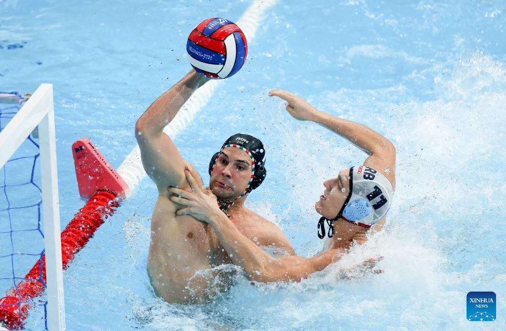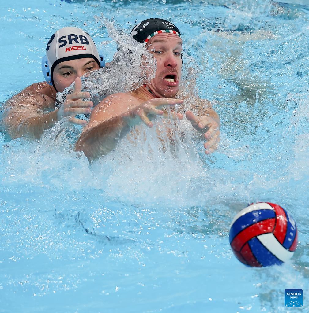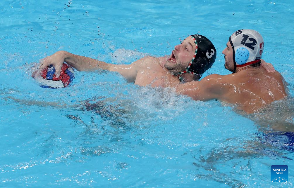 Hungary's Daniel Angyal (R) vies with Serbia's Dusan Mandic during the gold medal match between Serbia and Hungary at the Men's European Water Polo Championships in Belgrade, Serbia, Jan. 25, 2026. (Photo by Predrag Milosavljevic/Xinhua)