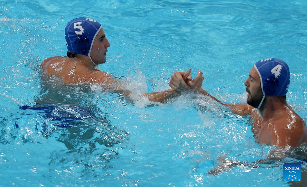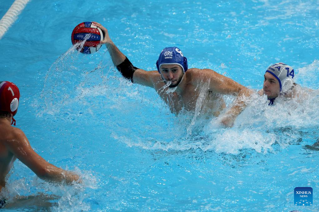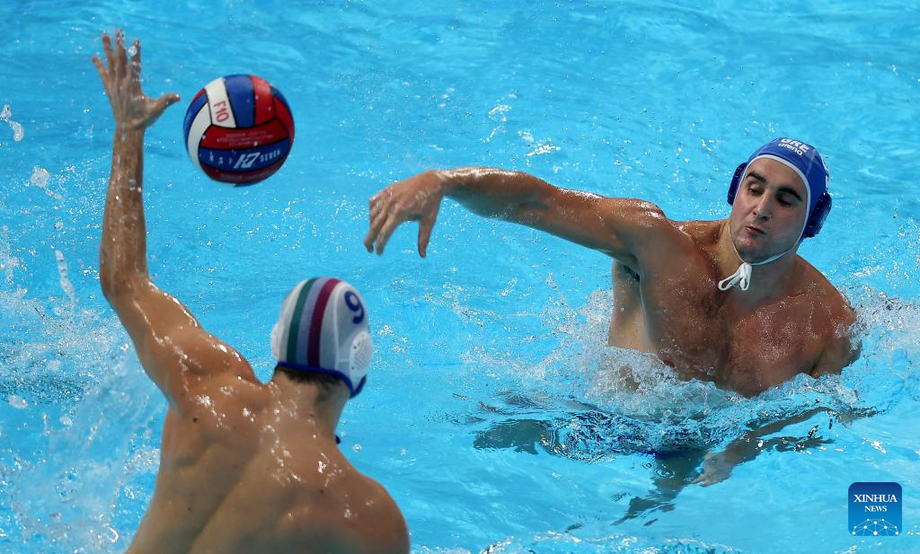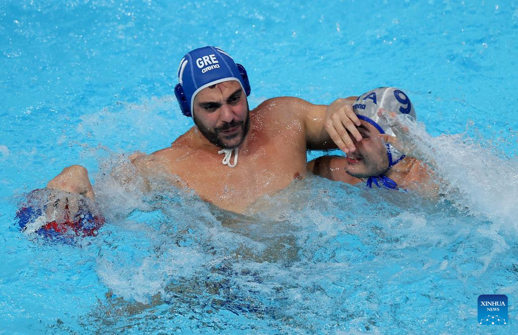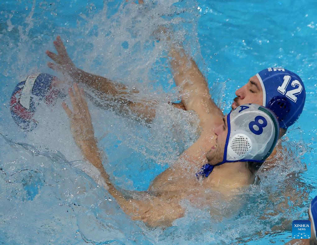 Greece's Dimitrios Nikolaidis (L) vies with Italy's Matteo Iocchi Gratta during the match for the bronze medal between Italy and Greece at the Men's European Water Polo Championships in Belgrade, Serbia, Jan. 25, 2026. (Photo by Predrag Milosavljevic/Xinhua)