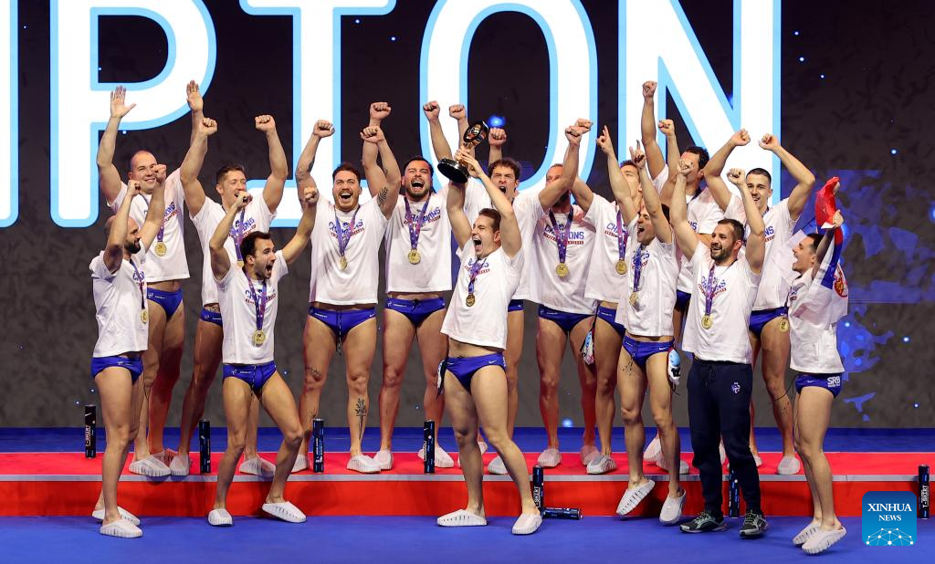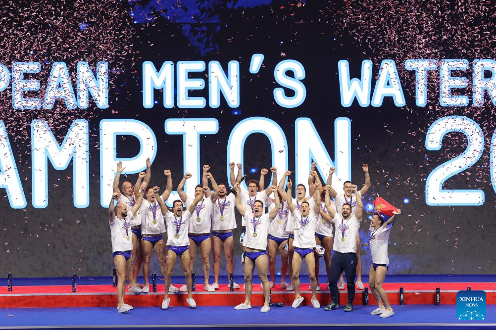 Serbia's team players celebrate with the trophy after the gold medal match between Serbia and Hungary at the Men's European Water Polo Championships in Belgrade, Serbia, Jan. 25, 2026. (Photo by Predrag Milosavljevic/Xinhua)
