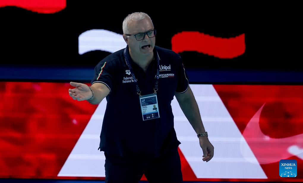 Italy's head coach Alessandro Campagna gestures during the match for the bronze medal between Italy and Greece at the Men's European Water Polo Championships in Belgrade, Serbia, Jan. 25, 2026. (Photo by Predrag Milosavljevic/Xinhua)