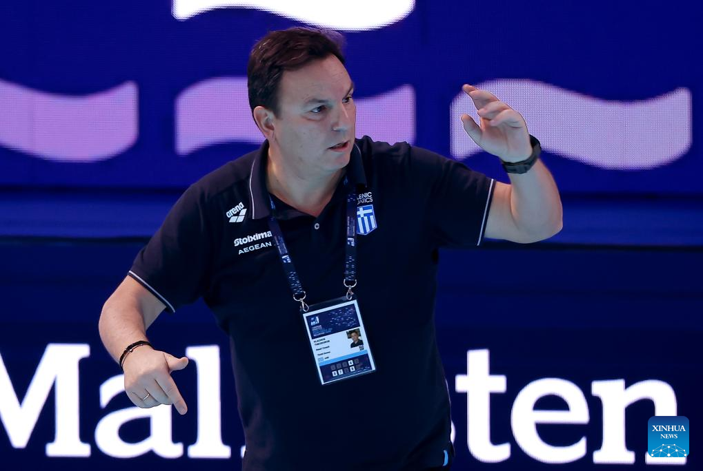 Greece's head coach Theodoros Vlachos gestures during the match for the bronze medal between Italy and Greece at the Men's European Water Polo Championships in Belgrade, Serbia, Jan. 25, 2026. (Photo by Predrag Milosavljevic/Xinhua)