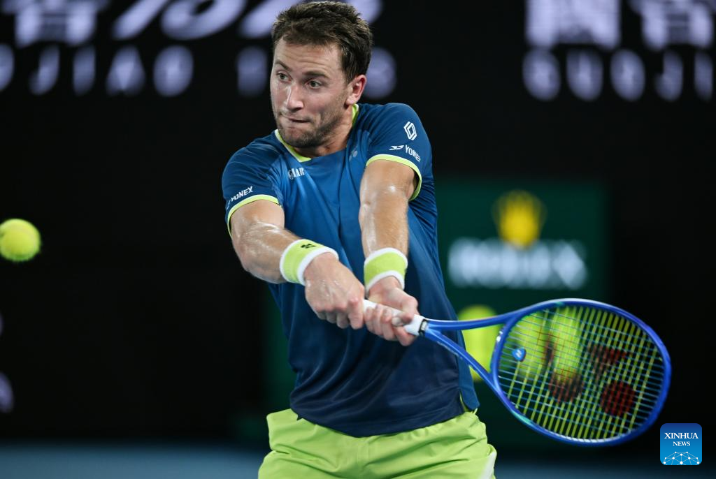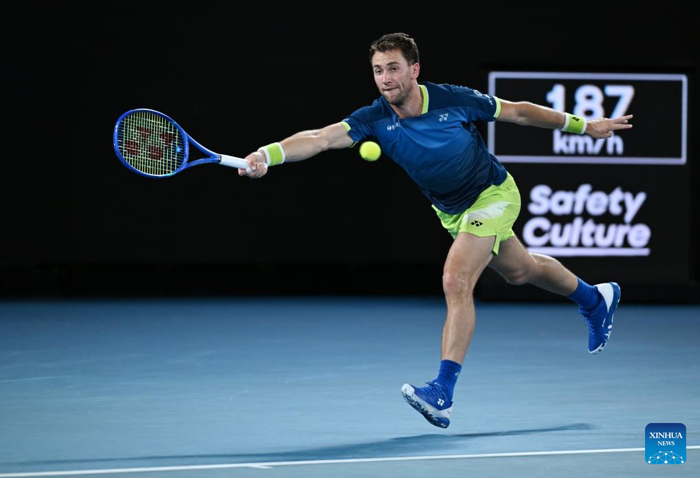 Casper Ruud hits a return during the men's singles 4th round match between Ben Shelton of the United States and Casper Ruud of Norway at the Australian Open tennis tournament in Melbourne, Australia, Jan. 26, 2026. (Photo by Wang Shen/Xinhua)