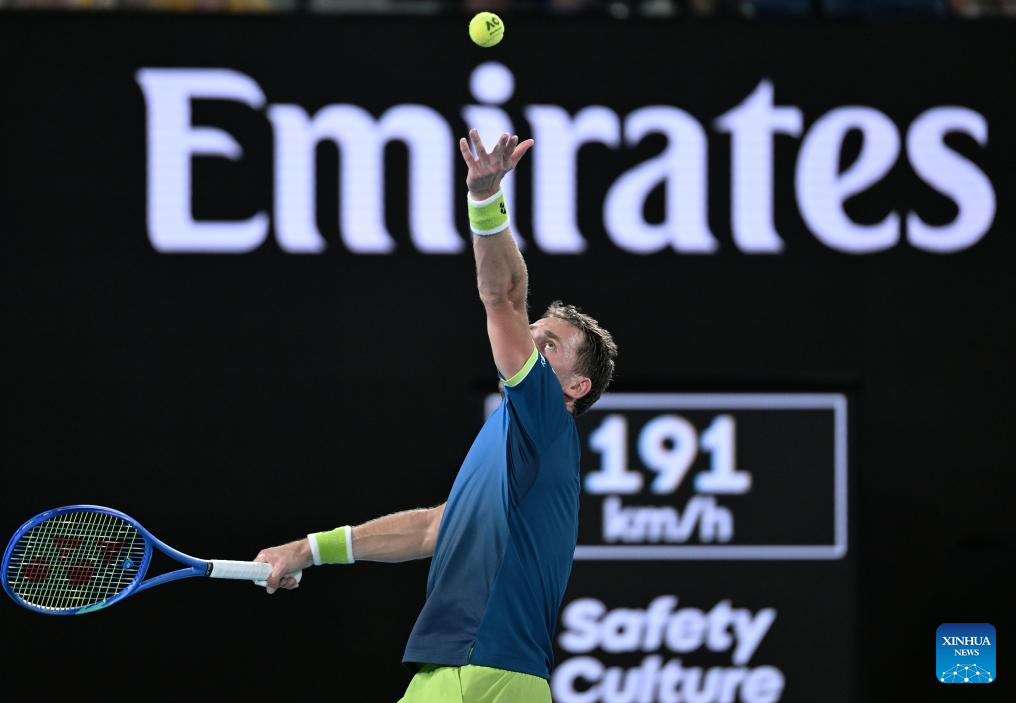 Casper Ruud serves during the men's singles 4th round match between Ben Shelton of the United States and Casper Ruud of Norway at the Australian Open tennis tournament in Melbourne, Australia, Jan. 26, 2026. (Photo by Wang Shen/Xinhua)