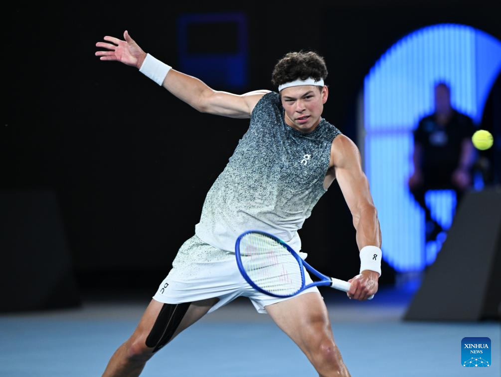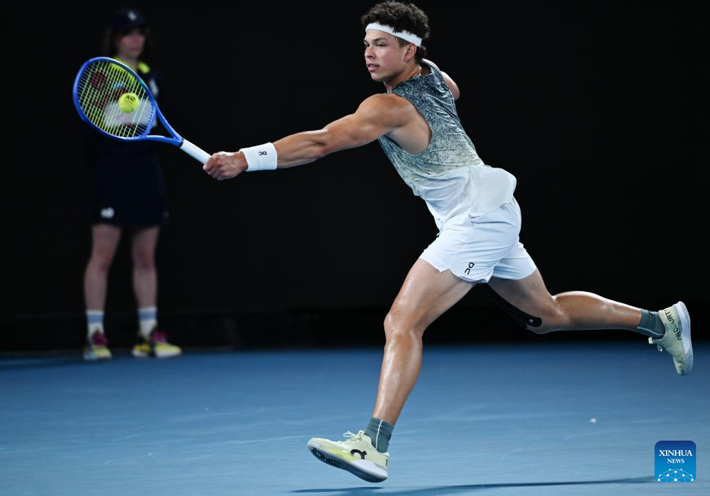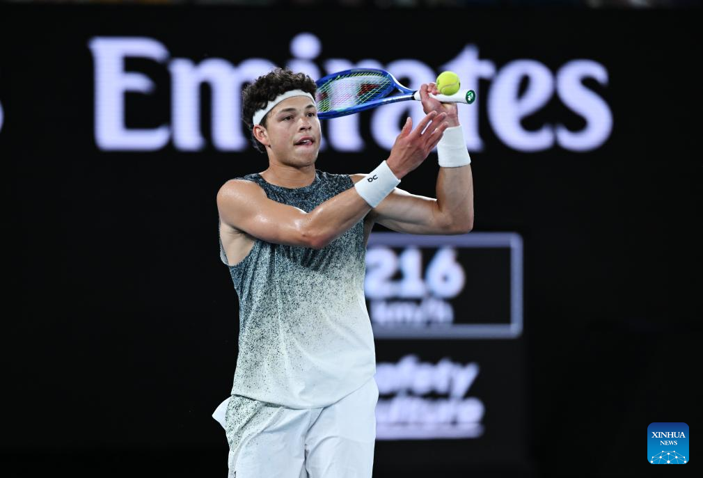 Ben Shelton hits a return during the men's singles 4th round match between Ben Shelton of the United States and Casper Ruud of Norway at the Australian Open tennis tournament in Melbourne, Australia, Jan. 26, 2026. (Photo by Wang Shen/Xinhua)