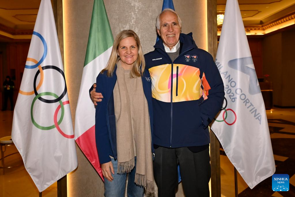 Giovanni Malago (R), President of the Milano Cortina 2026 Organizing Committee, poses with Kirsty Coventry, President of International Olympic Committee (IOC), after arrival at the hotel of the Olympic Family ahead of Milano Cortina 2026 Olympic Games in Milan, Italy, on Jan. 27, 2026. (Photo by Piero Cruciatti/Pool Photo via AFP)