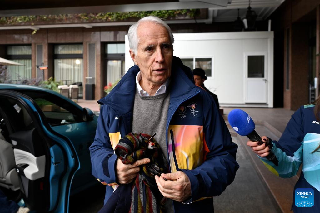 Giovanni Malago (R), President of the Milano Cortina 2026 Organizing Committee, arrives at the hotel of the Olympic Family ahead of Milano Cortina 2026 Olympic Games in Milan, Italy, on Jan. 27, 2026. (Photo by Piero Cruciatti/Pool Photo via AFP)