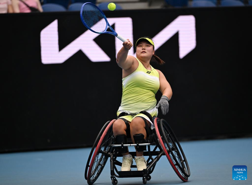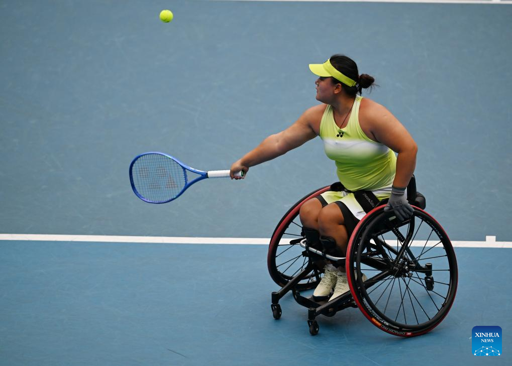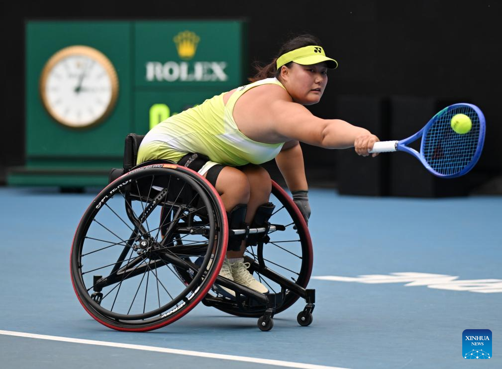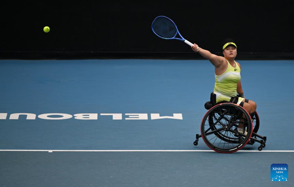 Li Xiaohui hits a return during the women's wheelchair singles final between Li Xiaohui of China and Diede De Groot of the Netherlands at the Australian Open tennis tournament in Melbourne, Australia, Jan. 31, 2026. (Photo by Wang Shen/Xinhua)