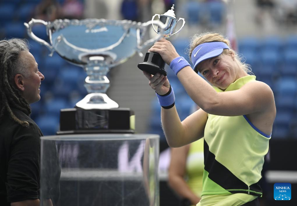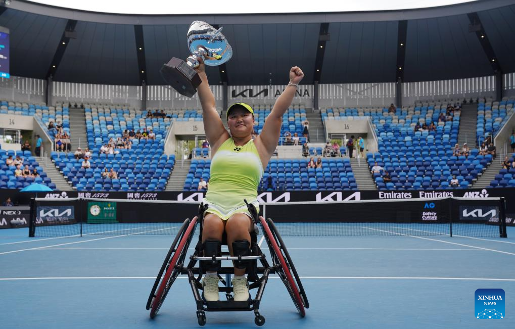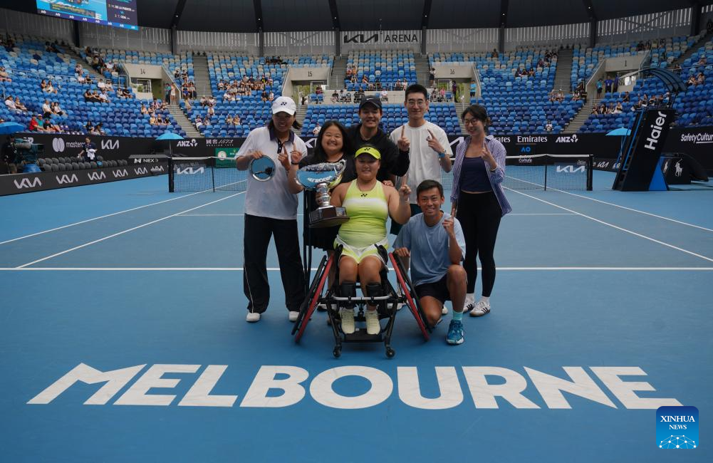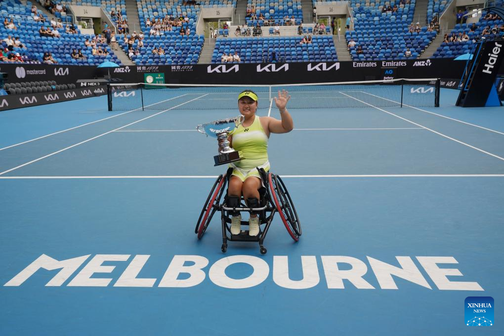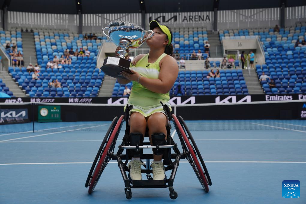 Gold medalist Li Xiaohui poses for photos with the trophy during the awarding ceremony for the women's wheelchair singles final between Li Xiaohui of China and Diede De Groot of the Netherlands at the Australian Open tennis tournament in Melbourne, Australia, Jan. 31, 2026. (Photo by Wang Shen/Xinhua)