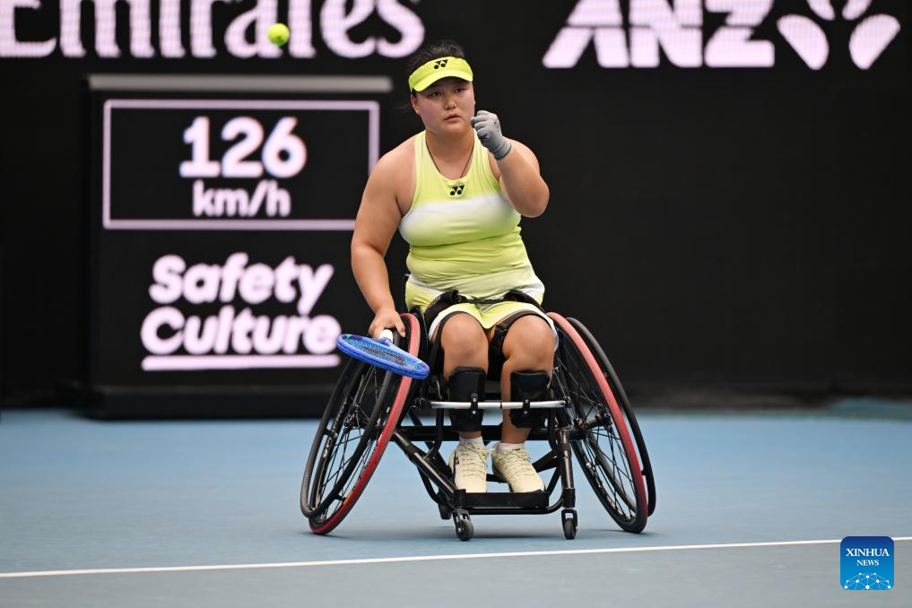 Li Xiaohui celebrates scoring during the women's wheelchair singles final between Li Xiaohui of China and Diede De Groot of the Netherlands at the Australian Open tennis tournament in Melbourne, Australia, Jan. 31, 2026. (Photo by Wang Shen/Xinhua)