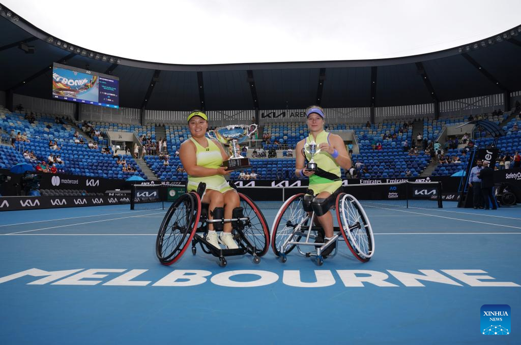 Gold medalist Li Xiaohui (L) and silver medalist Diede De Groot pose for photos during the awarding ceremony for the women's wheelchair singles final between Li Xiaohui of China and Diede De Groot of the Netherlands at the Australian Open tennis tournament in Melbourne, Australia, Jan. 31, 2026. (Photo by Wang Shen/Xinhua)