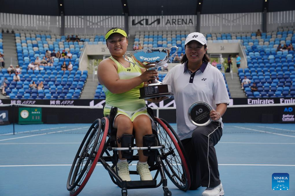 Gold medalist Li Xiaohui (L) poses for photos with her coach during the awarding ceremony for the women's wheelchair singles final between Li Xiaohui of China and Diede De Groot of the Netherlands at the Australian Open tennis tournament in Melbourne, Australia, Jan. 31, 2026. (Photo by Wang Shen/Xinhua)