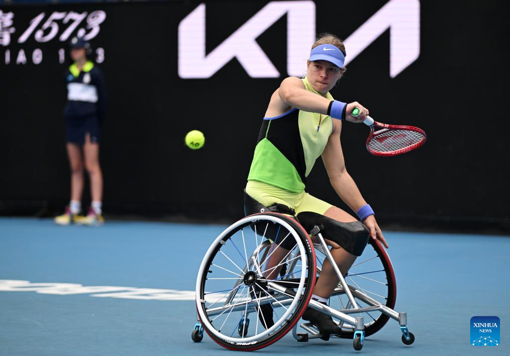 Diede De Groot hits a return during the women's wheelchair singles final between Li Xiaohui of China and Diede De Groot of the Netherlands at the Australian Open tennis tournament in Melbourne, Australia, Jan. 31, 2026. (Photo by Wang Shen/Xinhua)