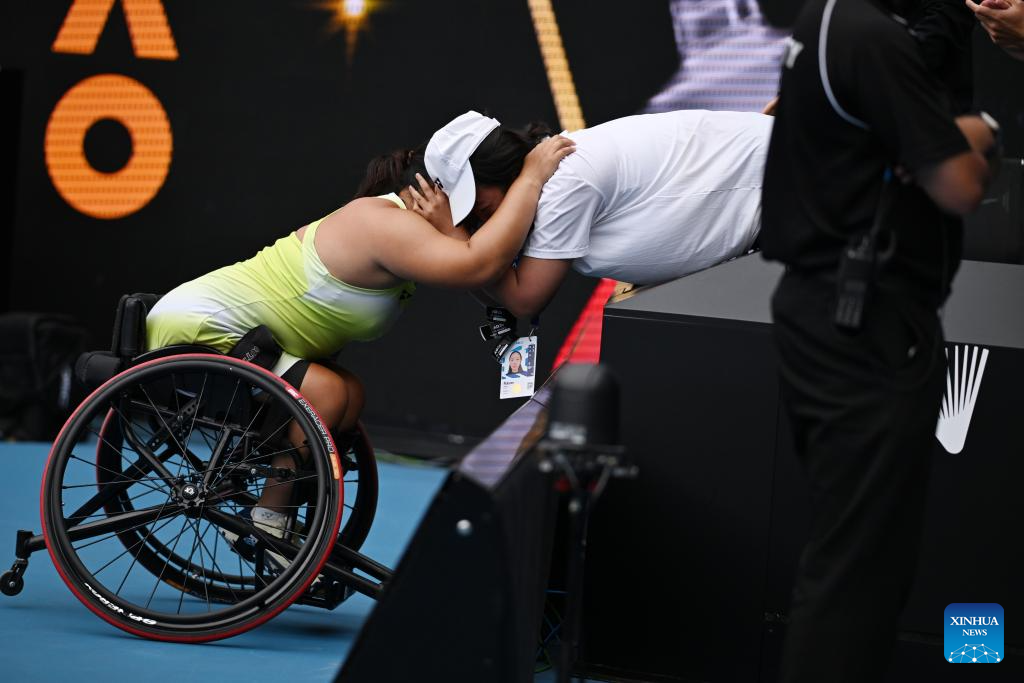 Li Xiaohui (L) celebrates winning the women's wheelchair singles final between Li Xiaohui of China and Diede De Groot of the Netherlands at the Australian Open tennis tournament in Melbourne, Australia, Jan. 31, 2026. (Photo by Wang Shen/Xinhua)