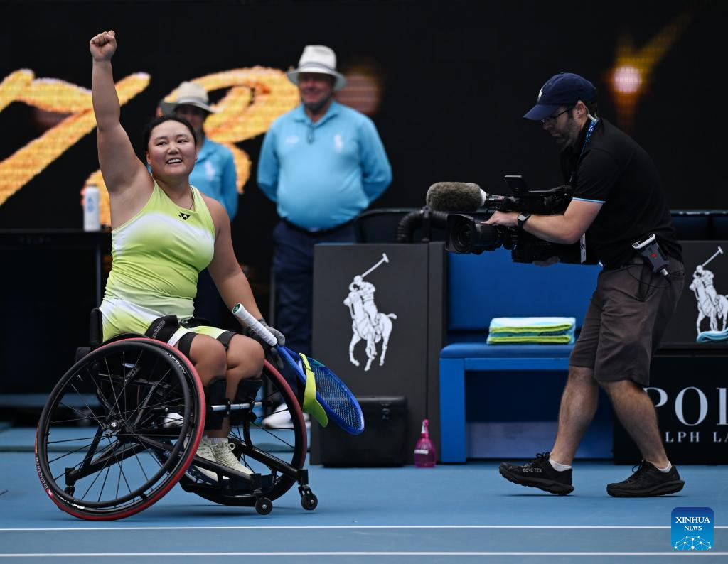 Li Xiaohui celebrates winning the women's wheelchair singles final between Li Xiaohui of China and Diede De Groot of the Netherlands at the Australian Open tennis tournament in Melbourne, Australia, Jan. 31, 2026. (Photo by Wang Shen/Xinhua)