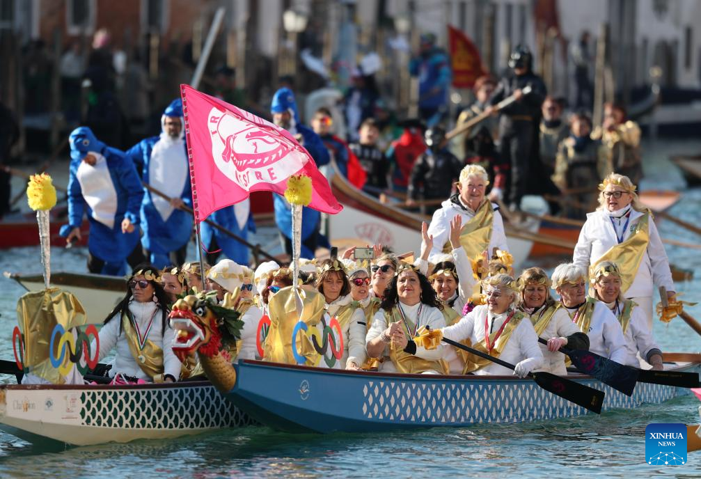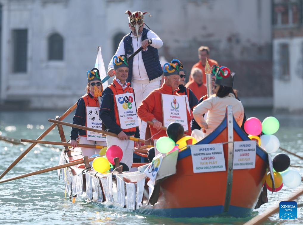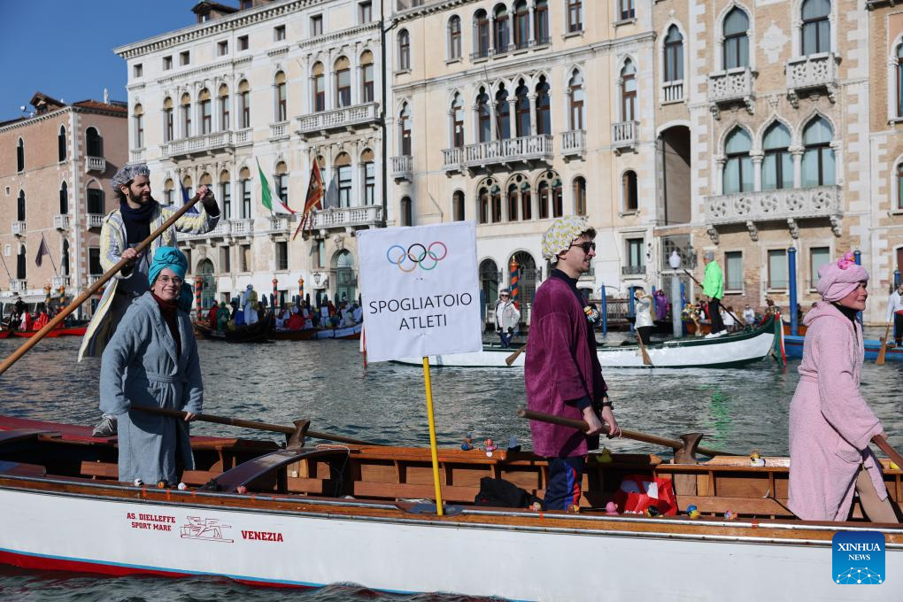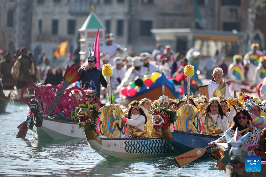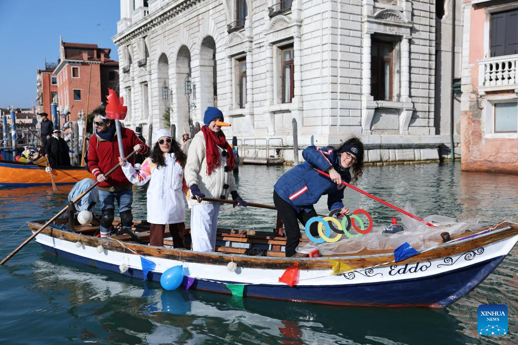 Revelers dress up in theme of the Olympic Games during the water parade of Venice Carnival in Venice, Italy, Feb. 1, 2026. The 2026 version of the traditional Venice Carnival runs from Jan. 31 to Feb. 17. (Xinhua/Li Jing)