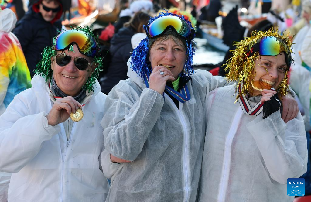 Revelers dressed up in theme of the Olympic Games pose during the water parade of Venice Carnival in Venice, Italy, Feb. 1, 2026. The 2026 version of the traditional Venice Carnival runs from Jan. 31 to Feb. 17. (Xinhua/Li Jing)