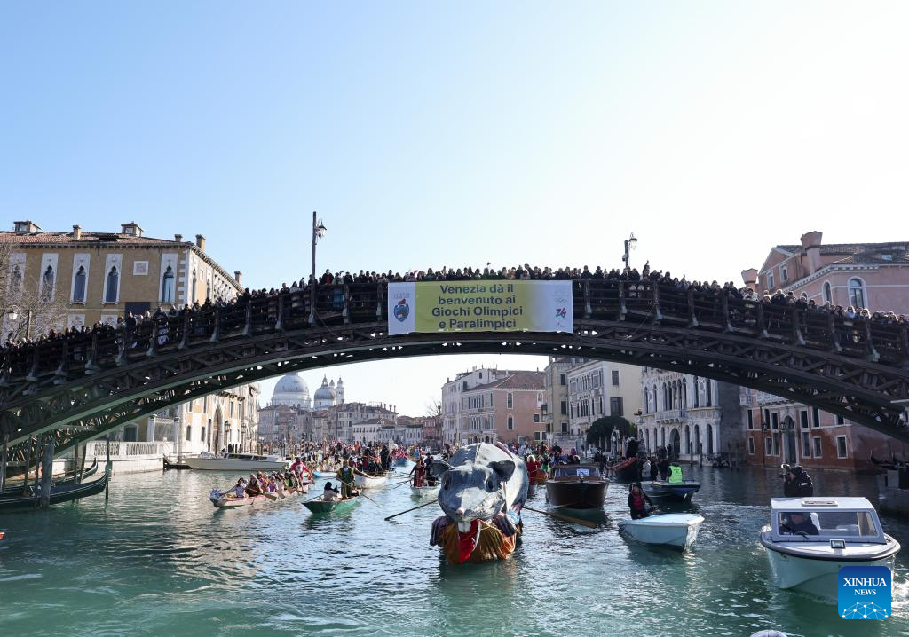 A banner written "Venice welcome Olympic and Paralympic Games" is seen on the Ponte dell' Accademia during the water parade of Venice Carnival in Venice, Italy, Feb. 1, 2026. The 2026 version of the traditional Venice Carnival runs from Jan. 31 to Feb. 17. (Xinhua/Li Jing)