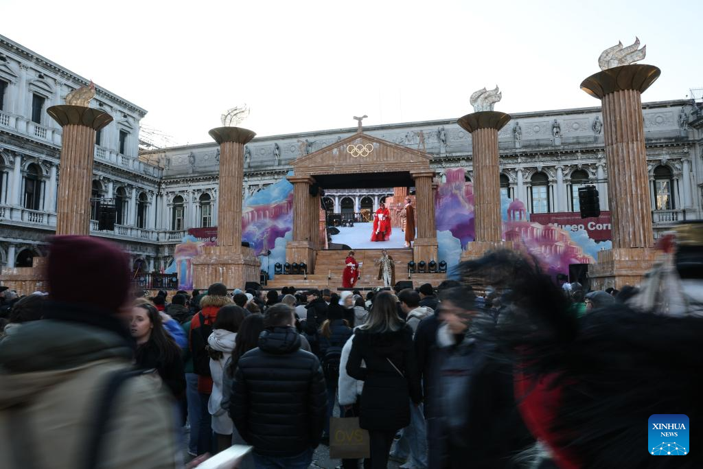 Artists perform on the main stage of the Venice Carnival which is decorated in theme of the Olympic Games at St. Mark's Square in Venice, Italy, Feb. 1, 2026. The 2026 version of the traditional Venice Carnival runs from Jan. 31 to Feb. 17. (Xinhua/Li Jing)