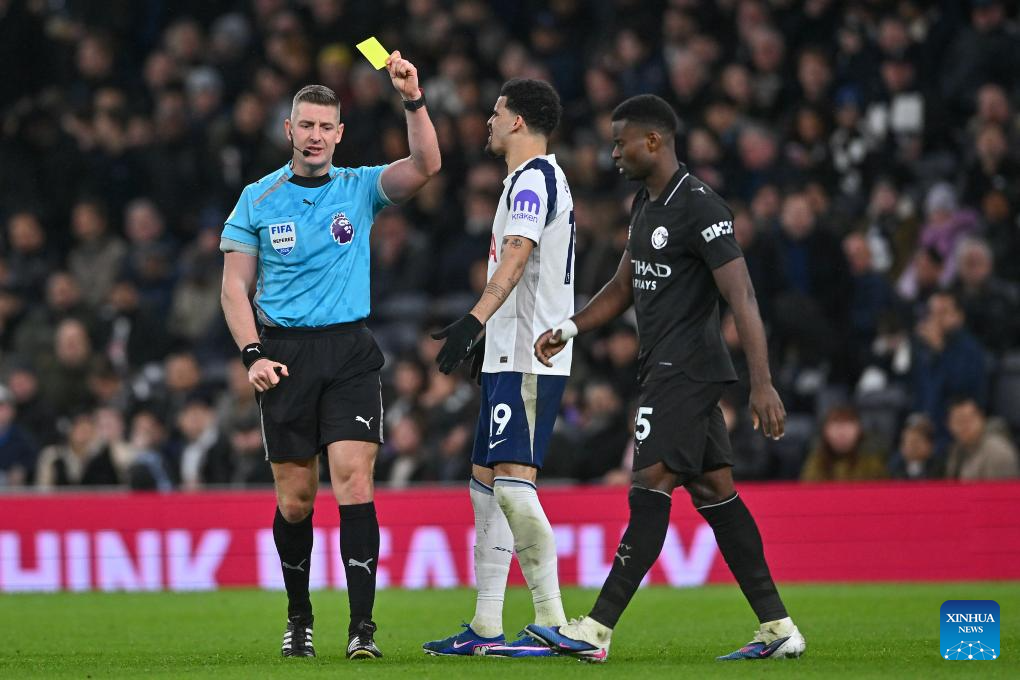 Dominic Solanke (C) of Tottenham Hotspur is shown the yellow card during the English Premier League match between Tottenham Hotspur and Manchester City in London, Britain, on Feb. 1, 2026. (Xinhua)