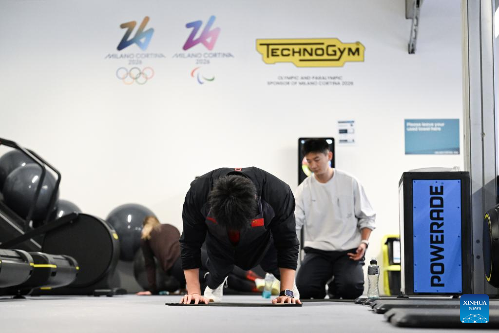 Chinese athlete Li Chunjian (front) exercises in the gym at the Cortina D'Ampezzo Olympic & Paralympic Village ahead of the 2026 Milan-Cortina Winter Olympics in Cortina D'Ampezzo, Italy, Feb. 3, 2026. (Xinhua/Lian Yi)