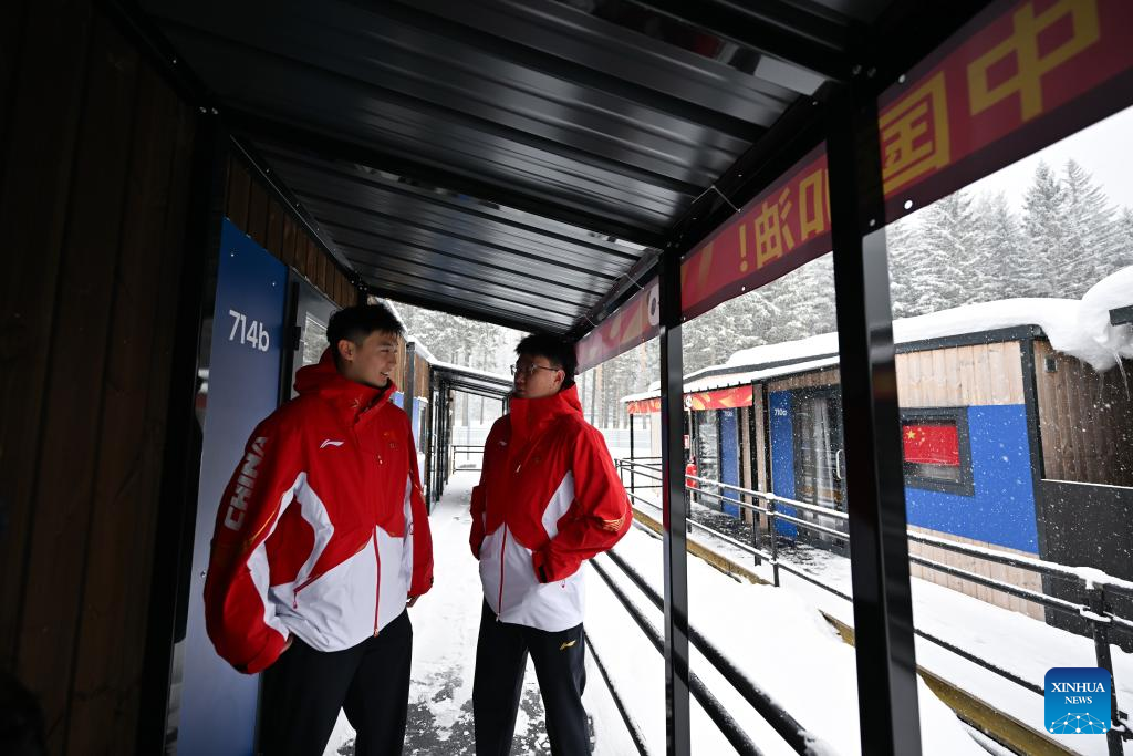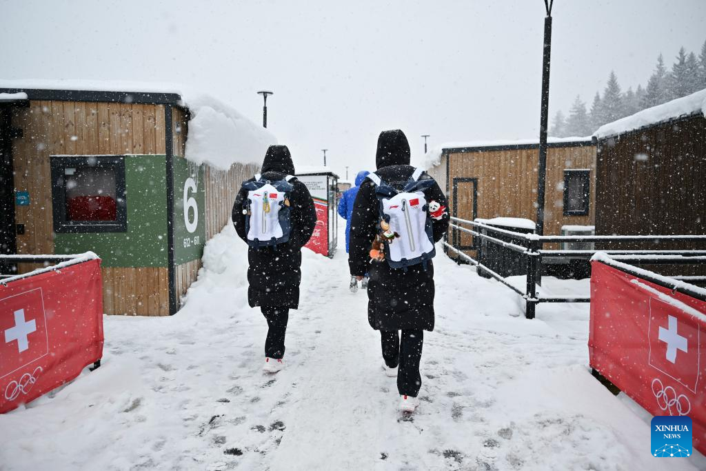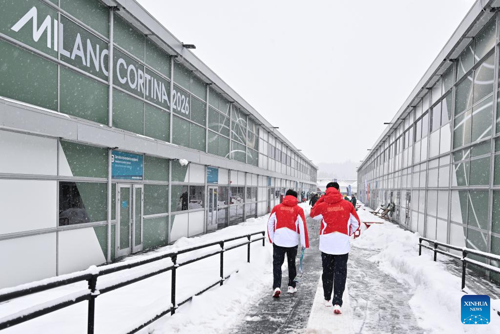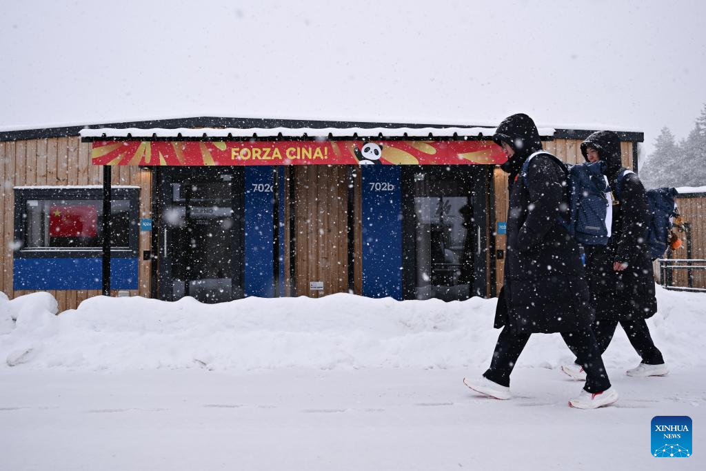 Members of Chinese delegation walk at the Cortina D'Ampezzo Olympic & Paralympic Village ahead of the 2026 Milan-Cortina Winter Olympics in Cortina D'Ampezzo, Italy, Feb. 3, 2026. (Xinhua/Lian Yi)