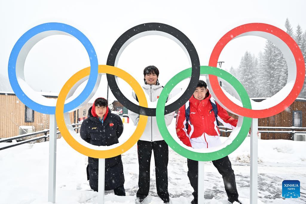 Chinese athletes Shi Yaolong, Ding Yunda and Sun Kaizhi (L to R) pose for photos at the Cortina D'Ampezzo Olympic & Paralympic Village ahead of the 2026 Milan-Cortina Winter Olympics in Cortina D'Ampezzo, Italy, Feb. 3, 2026. (Xinhua/Lian Yi)